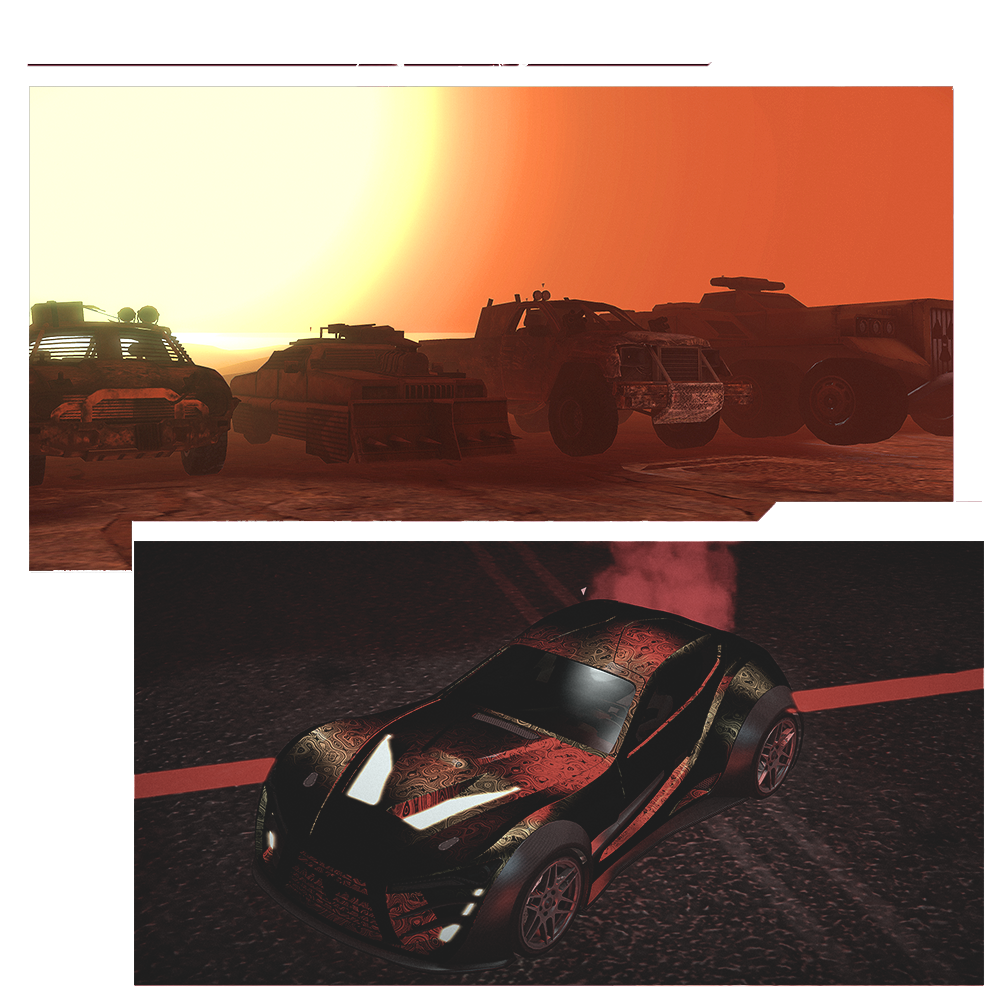Various nomadic scrap-built vehicles on the Martian surface (Top). A Ferrera Capo drifting along the pavement (Bottom).